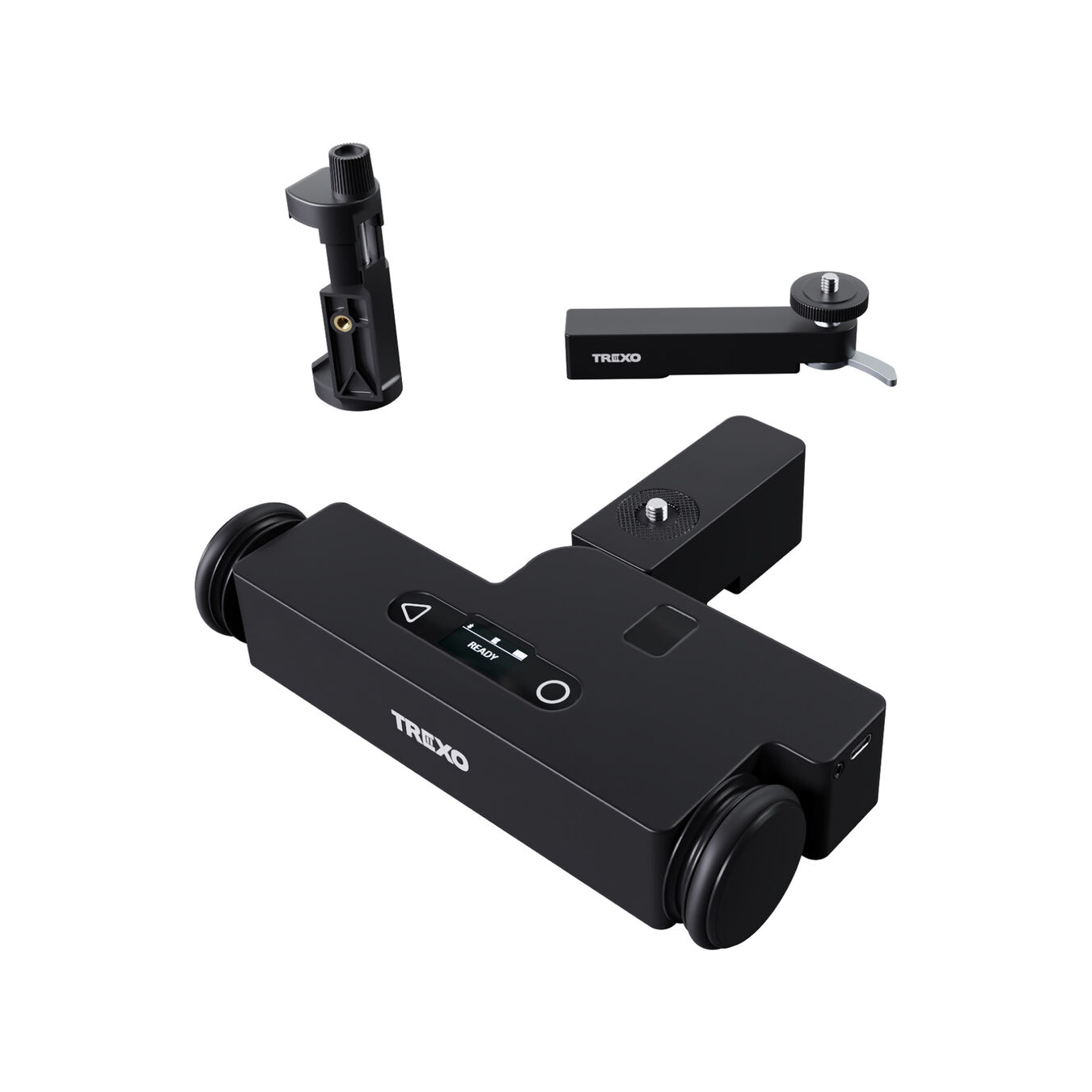 The TREXO Wheels Motorized Tabletop Dolly is a compact motion control solution designed to enhance video shooting with smooth, customizable movements. Constructed from sturdy aluminum and stainless steel, it can handle loads up to 5.9 lb and supports both linear and 360° circular motion. Onboard tap-to-move button controls are included, while more advanced multi-point paths can be set up through the easy-to-use mobile app.