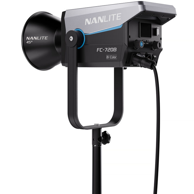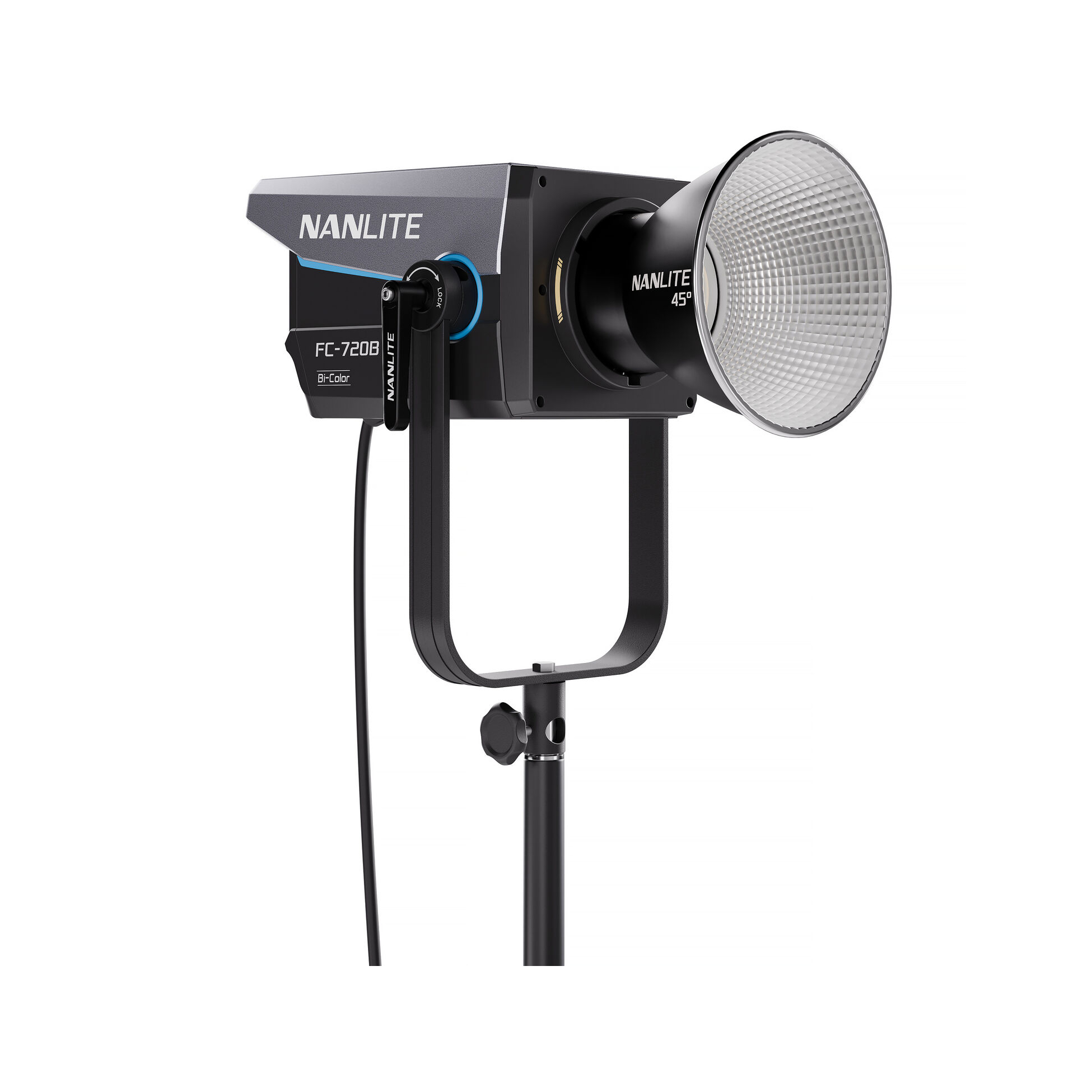 Built to offer the versatility of a true bi-color lighting solution, the FC720B Bi-Color LED Spotlight from Nanlite is a compact yet powerful AC-powered fixture with an adjustable color temperature range from 2700 to 6500K. Its distinctive wing-inspired top housing gives the FC720B a unique look that sets it apart within the Nanlite lineup. Producing high output, the light delivers accurate and consistent color performance with a CRI of 96 and a TLCI of 98, while offering advanced functionality through user-friendly onboard controls as well as remote operation options.