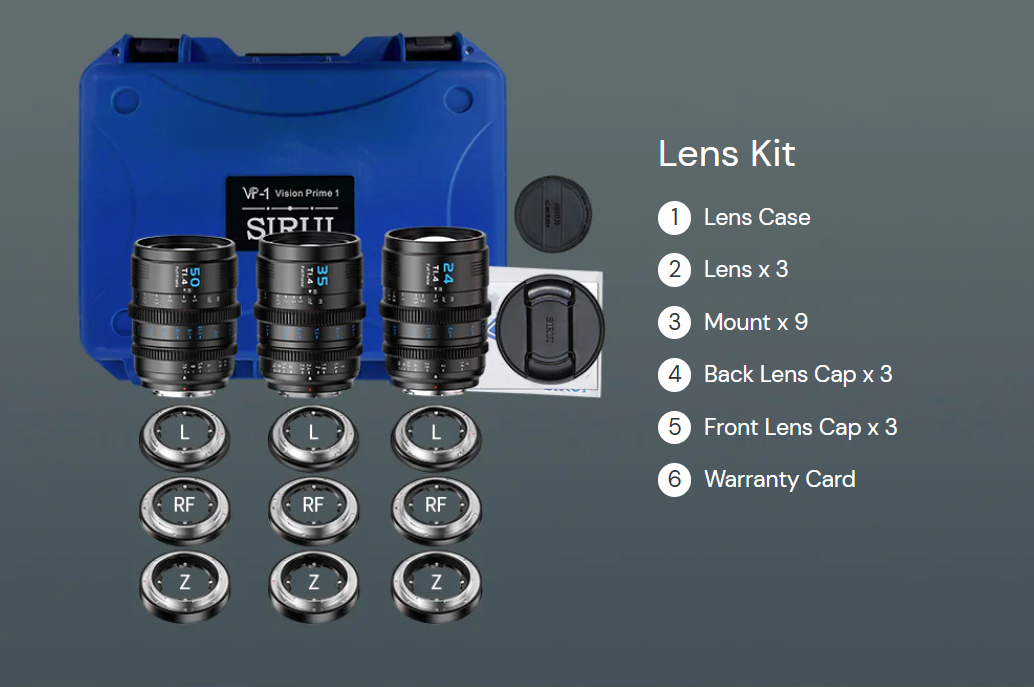 SIRUI Vision Prime 1 Series T1.4 FF Cine Lens Kit with 24mm/35mm/50mm (Interchangable Mount, Metal Grey)