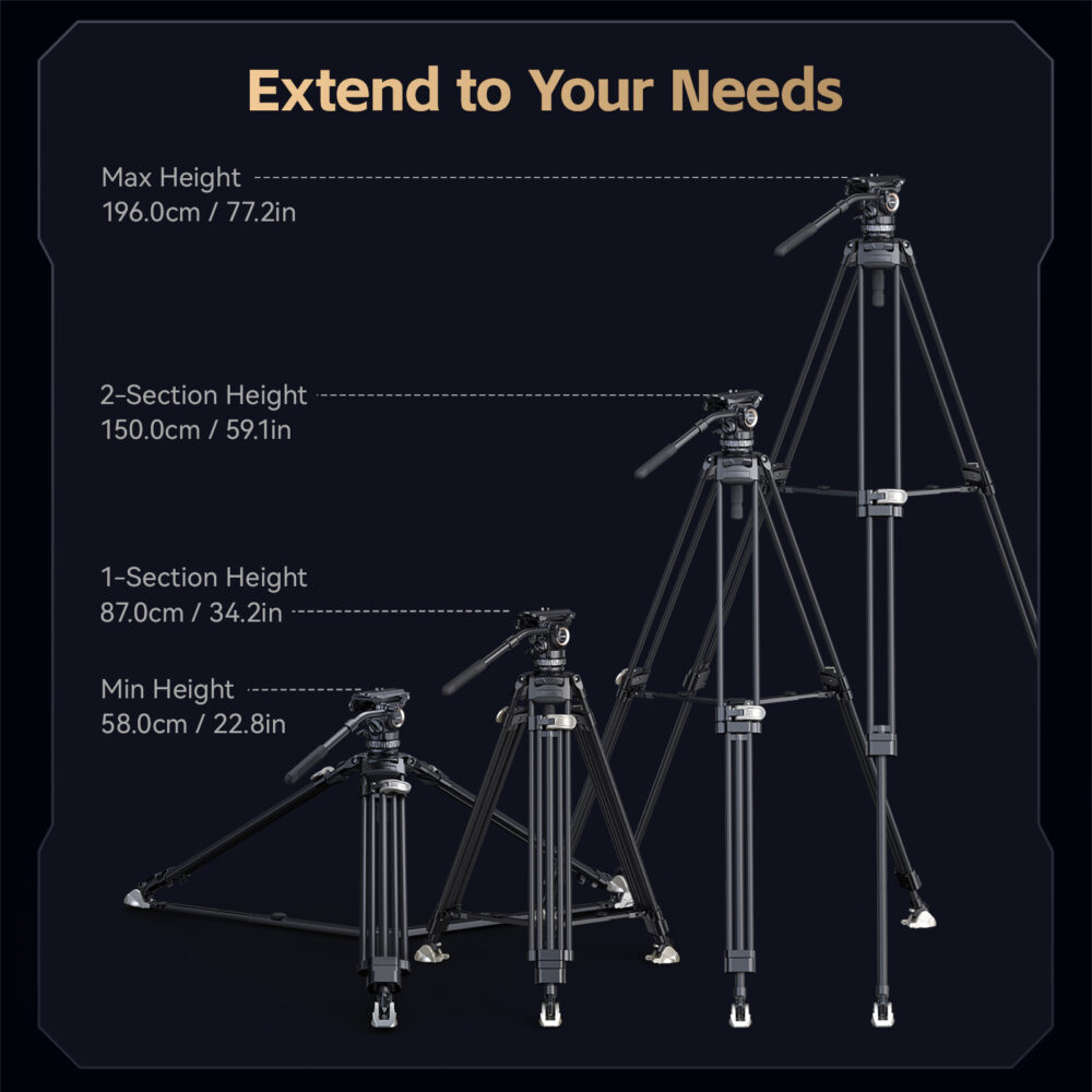 · One-Step Height Adjustment:Professional video tripod with adjustable legs, quick one-step lock for extension/retraction (no 6-step process), height range 23″-77″ (58 cm-196 cm), folded length 38″ (97 cm). Includes ground/mid-level spreaders, interchangeable flat/spike feet.