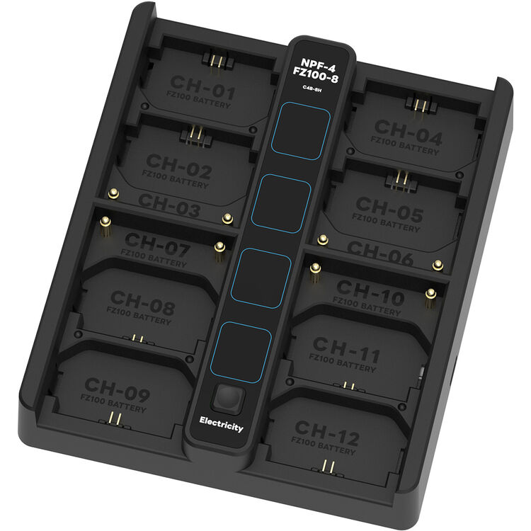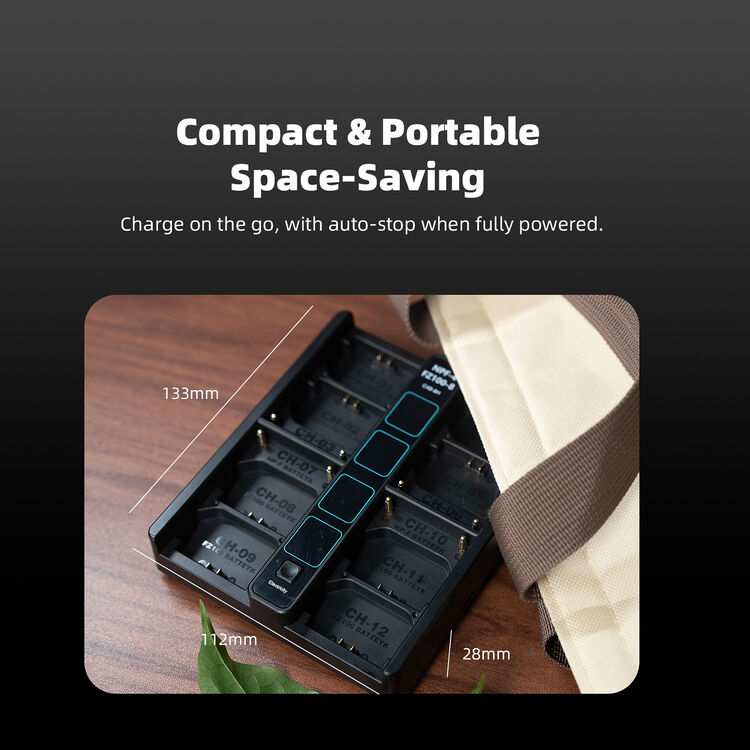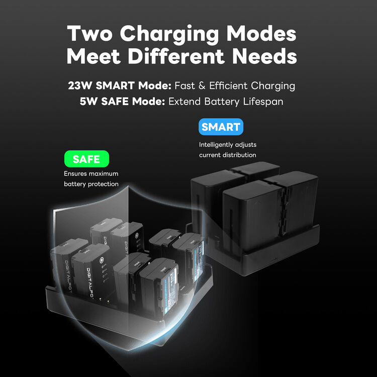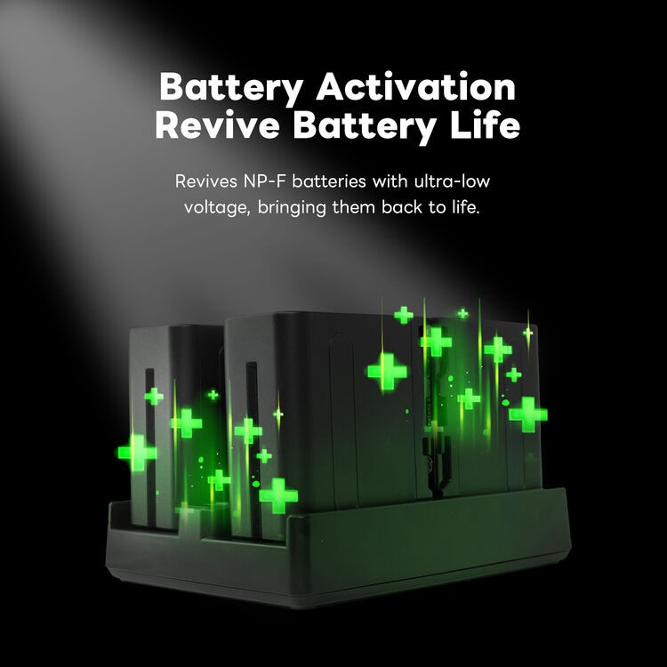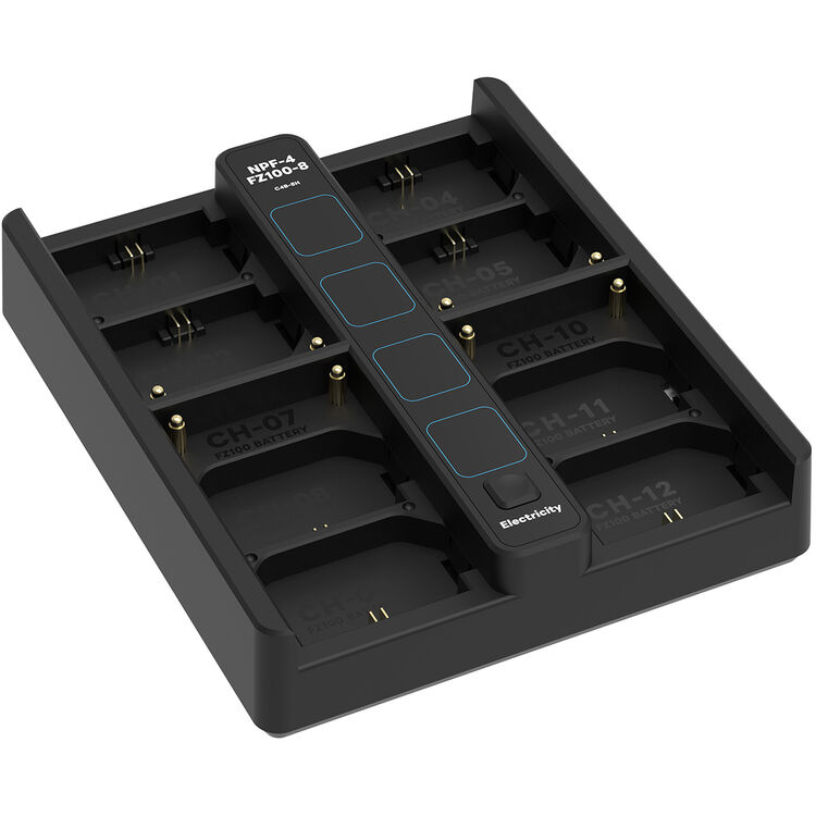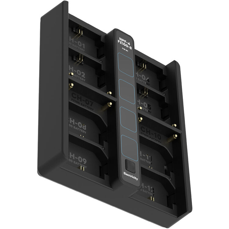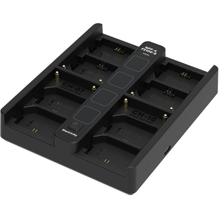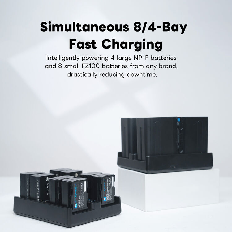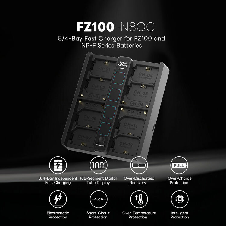 The charger supports simultaneous charging of up to eight NP-FZ100 batteries or four NP-F550, NP-F750, or NP-F970 batteries, with the flexibility to mix compatible battery types. Built-in intelligent protection safeguards against overdischarge, overcharging, short circuits, overheating, and electrostatic damage, ensuring reliable and secure operation.