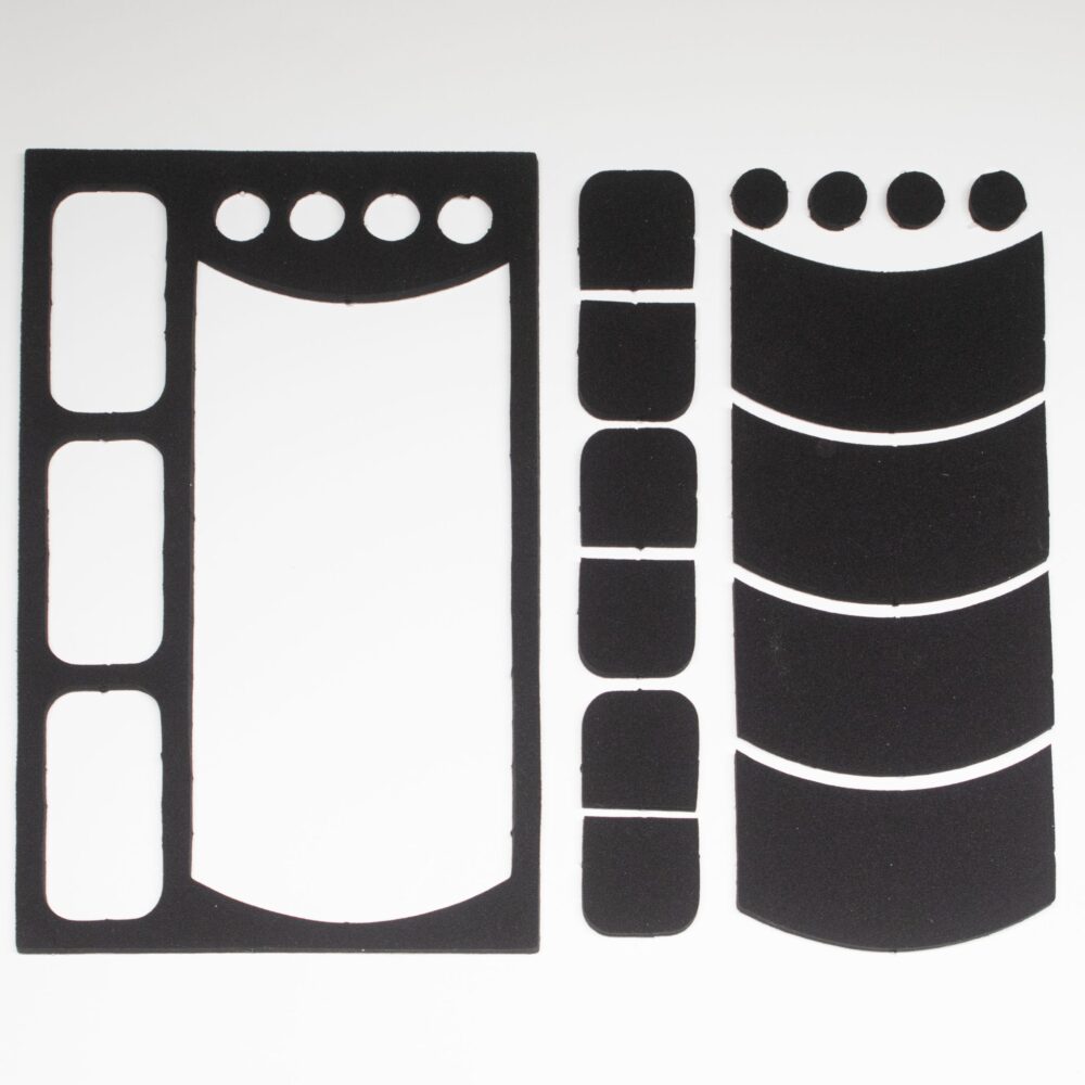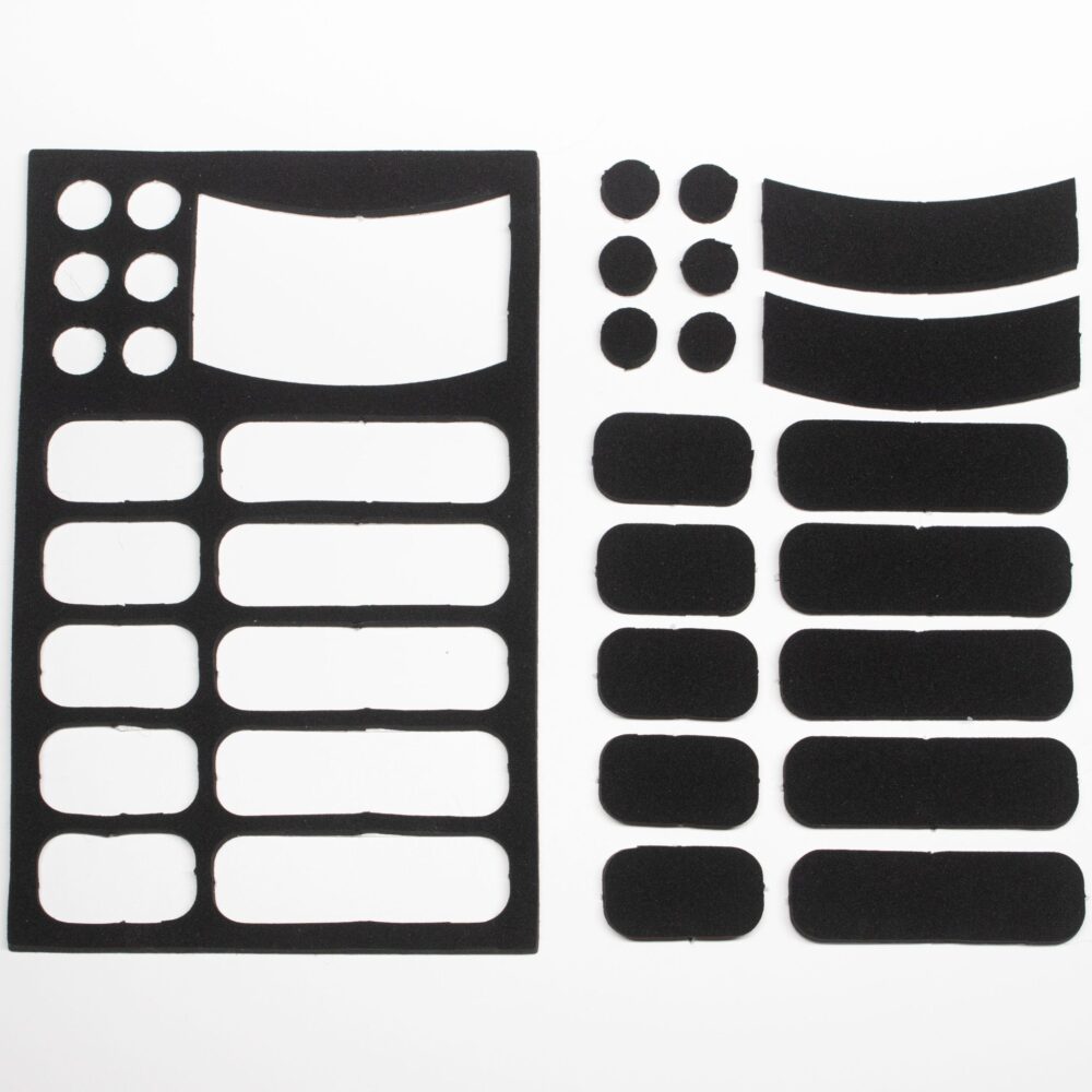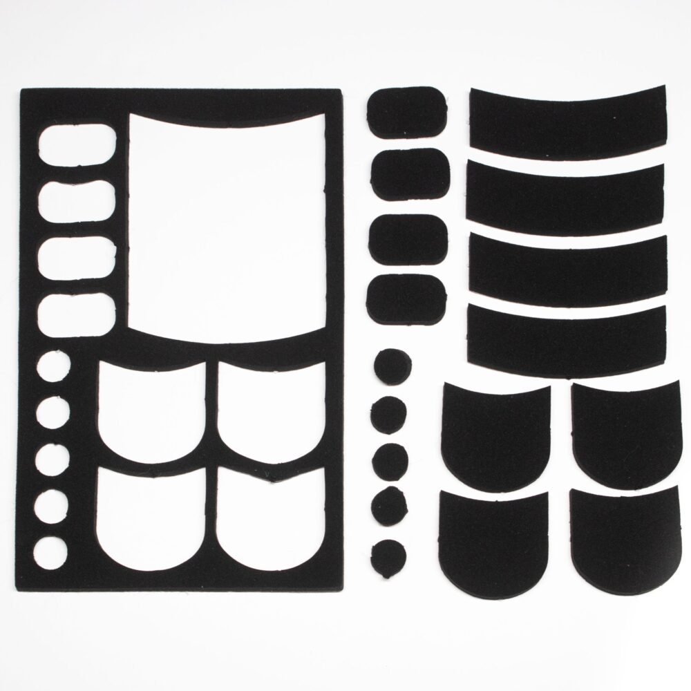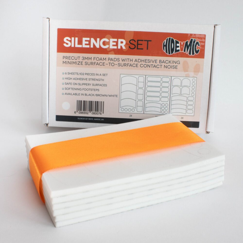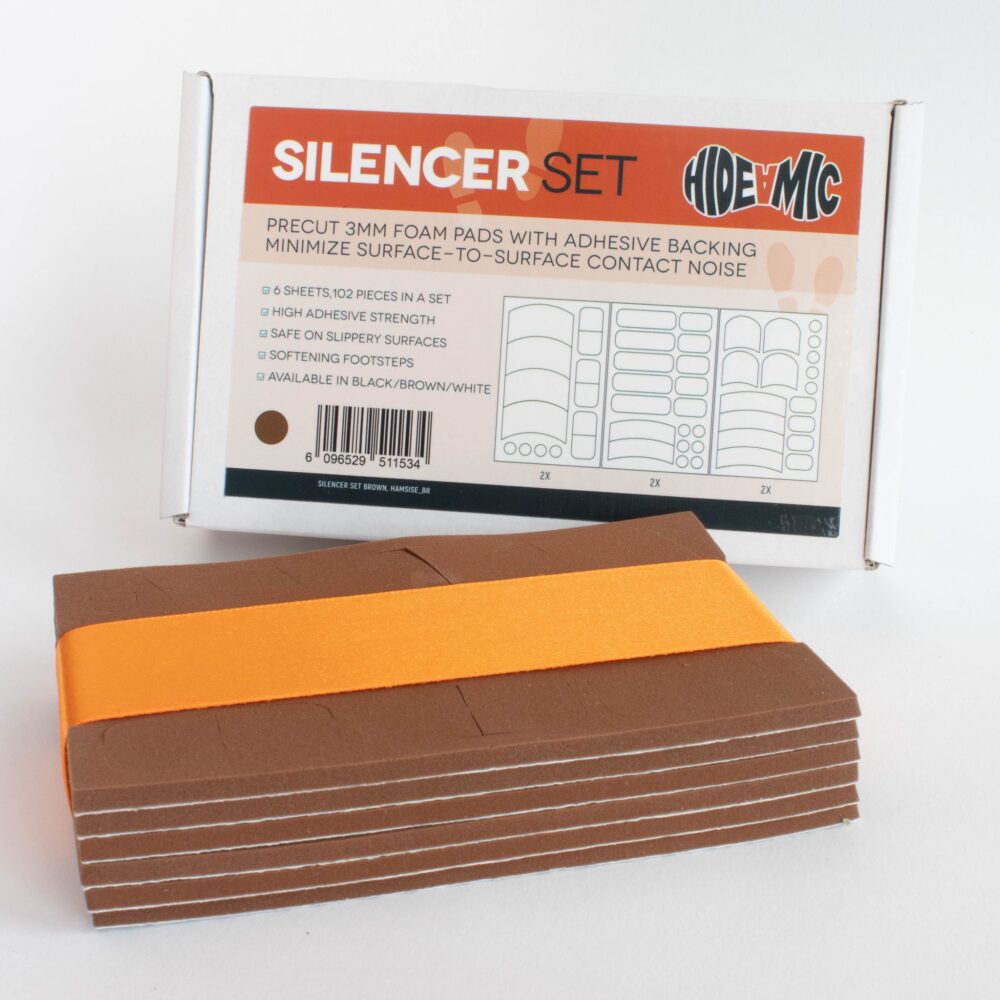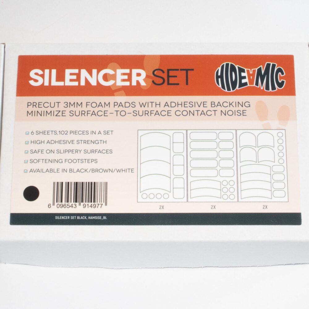 Hide-a-mic Silencer Set, perfect for reducing unwanted surface-to-surface noise on set. The Silencer Set uses premium 3mm industrial foam with a strong 3M adhesive backing for durable sound-dampening. The foam is tough enough to serve as shoe silencers, non-slip even when wet, and is easy to remove. Each set includes 6 sheets with a variety of shapes, totaling 102 stickers, available in Black, Brown and White.