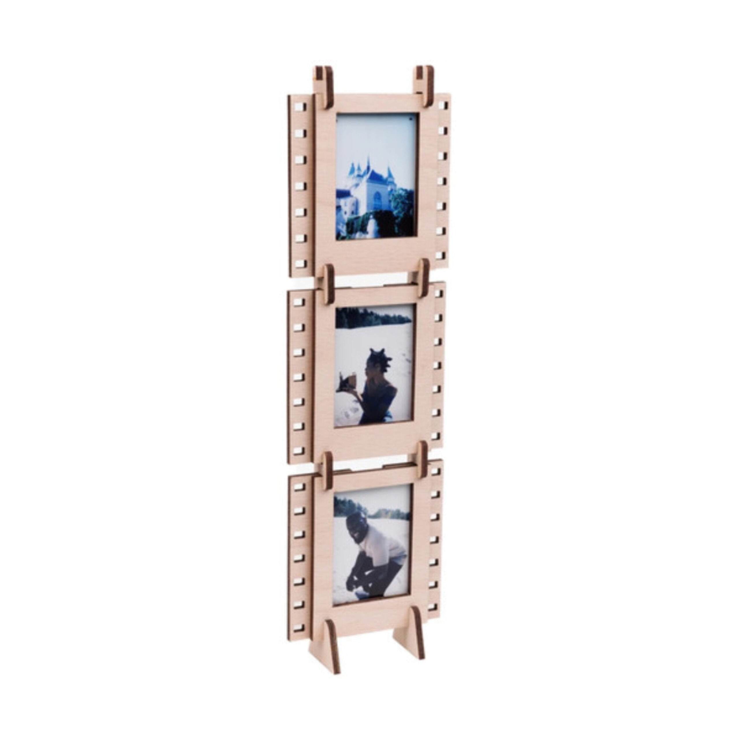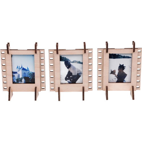 The JollyLook Photo Frames Mini is a set of three interconnectable plywood frames designed for Instax Mini film photos, featuring a natural wood finish. These versatile frames can be displayed on a wall or tabletop in both vertical and horizontal orientations. Perfect for organizing and showcasing your favorite Instax Mini memories, they combine functionality with a charming aesthetic.