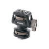 ARCA dovetail slot on top holds Baseline ARCA Dovetails and can be top-loaded, or installed from the back by sliding in. When sliding in from the back, a safety pin will engage with a pop when properly installed. Adjust the position, then lock the ratcheting thumbscrew. Top-loading can be achieved by loosening the thumbscrew, pulling out on the ratcheting knob, and turning the thumbscrew until the ARCA clamp has opened fully. Reverse the process to tighten.