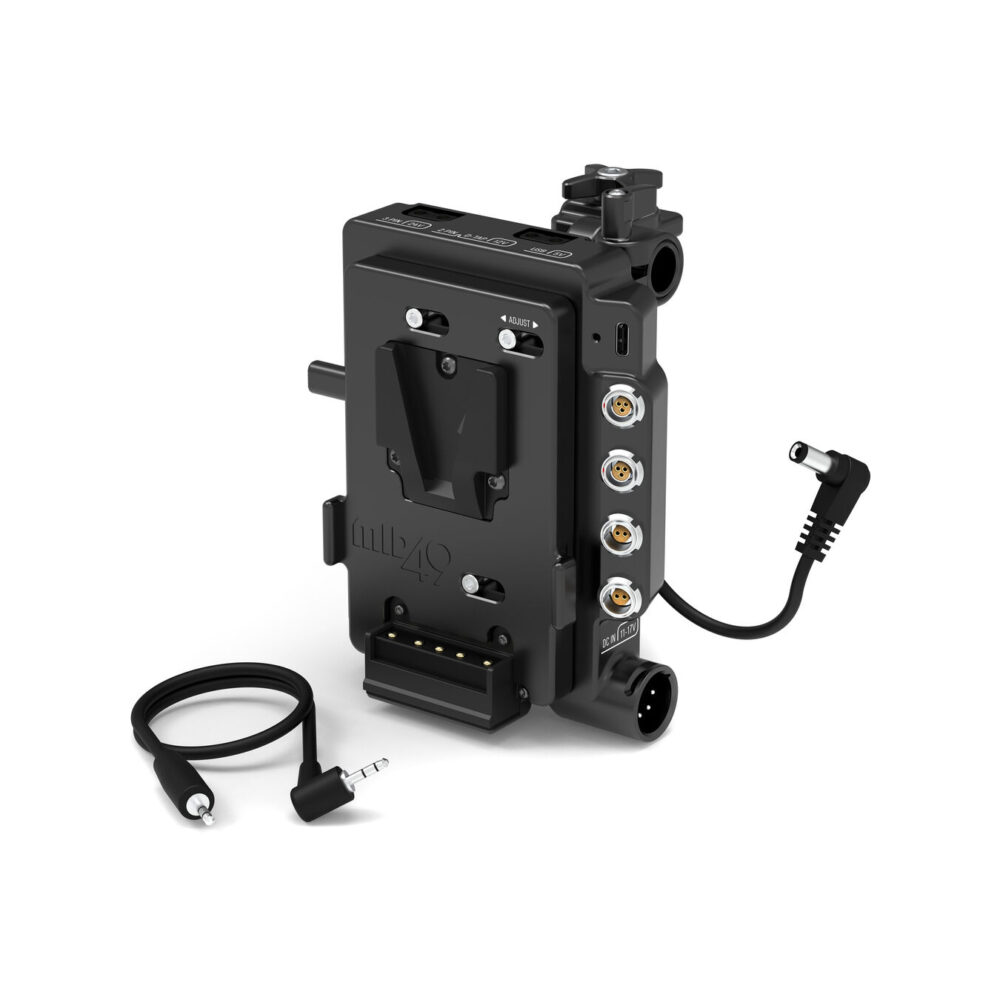 Power Distribution Box DB-4 (Canon C80, V-Mount) attaches directly to the shoe mount of the C80 using locking pins and pressure and provides intelligent power distribution with D-Taps, 5V USB-C PD, 3pin Fischers, and 2pin LEMO compatible connectors. Removable REMOTE LANC cable enables remote start/stop capability using 3pin Fischer devices.