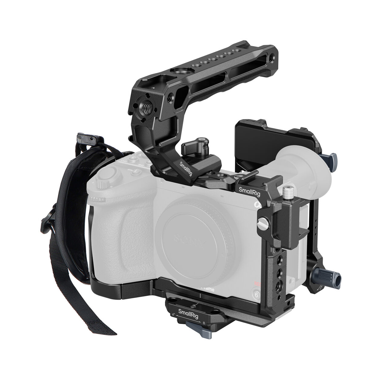 The SmallRig Advanced Camera Cage Kit is engineered to protect your Sony FX2 while expanding its mounting capabilities, enabling you to build a handheld rig suited for your production needs. This advanced kit includes a V-mount battery plate, a top handle, and a wrist strap for enhanced functionality. The cage also features a removable top plate with a NATO rail, allowing for the attachment of the Sony XLR top handle or other compatible handles without obstructing the EVF.
