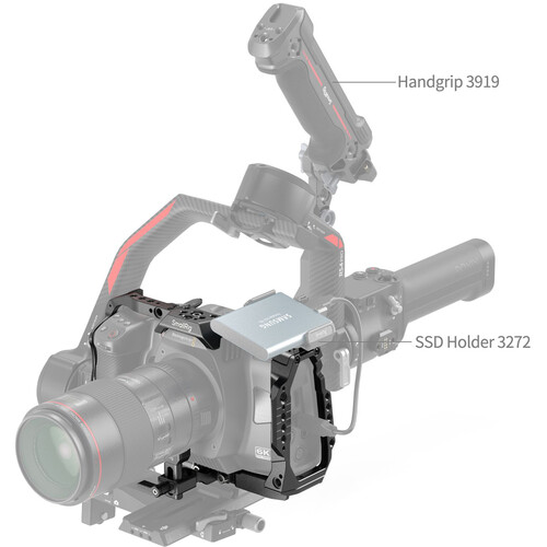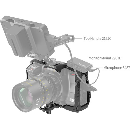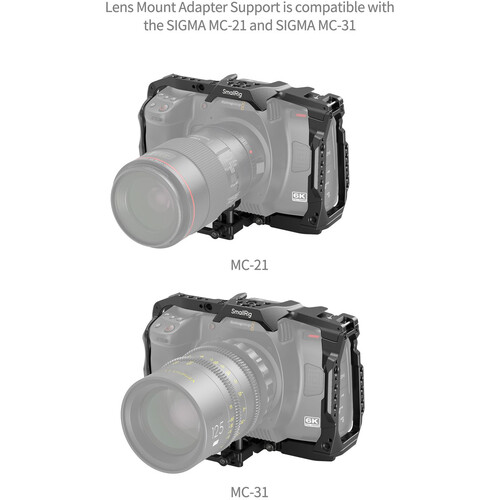 Protect your Blackmagic Design Cinema Camera 6K and enhance its versatility with the SmallRig Camera Cage. Crafted from durable aluminum, this cage offers robust protection and accessory mounting options, including a shoe mount, side NATO rail, multiple 1/4″-20 threads, and 3/8″-16 ARRI-style accessory mounts positioned on the top, sides, and bottom. The included lens adapter support ensures stability for heavier lenses when using adapters like the Sigma MC-21/31 or similar.