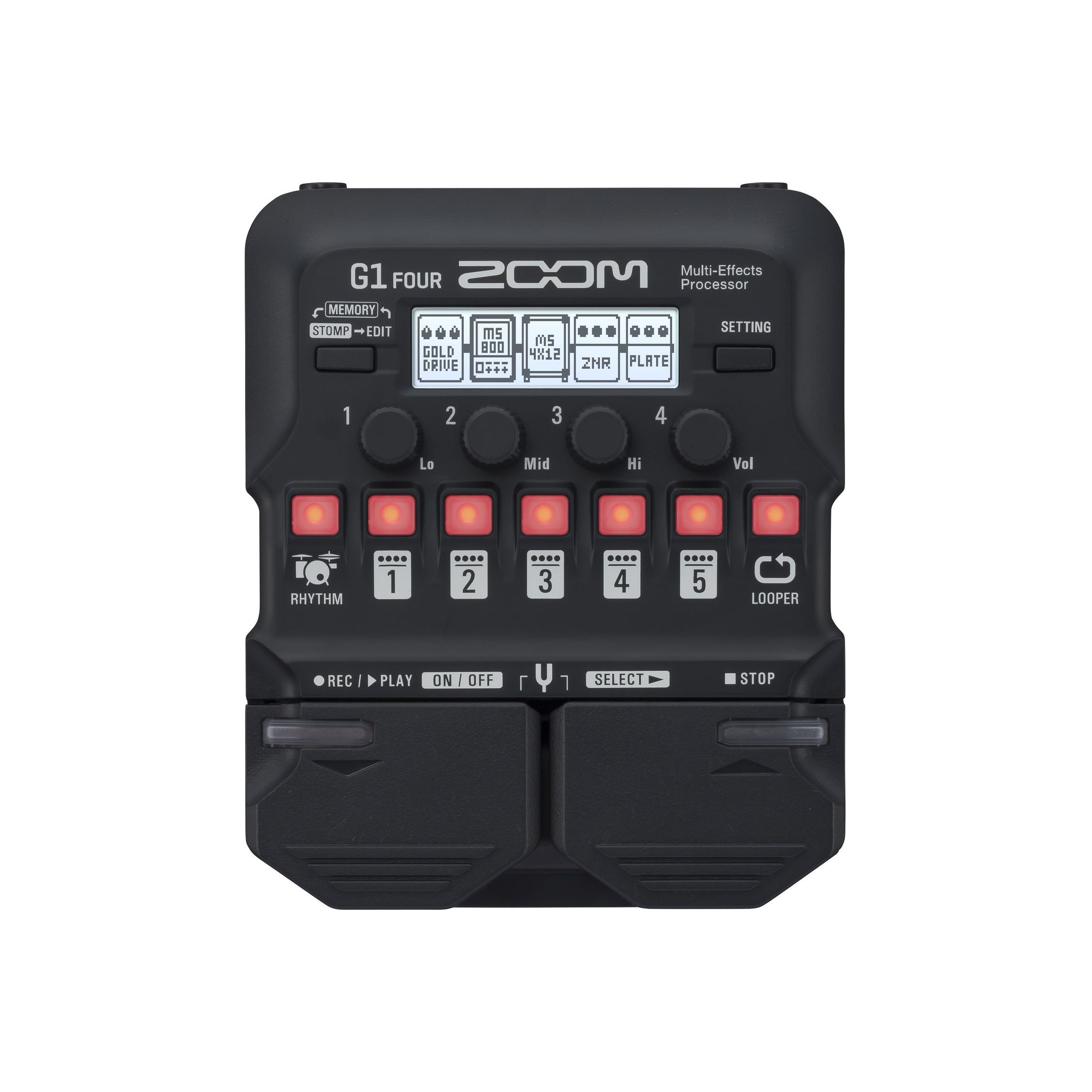 Zoom G1 Four is a multi-effects processor designed for use with electric guitars. Offered in an easy to use stompbox format, the G1 Four sports a wide selection of effects, amp emulations, and other features, such as an onboard 30-second looper and a chromatic tuner. With 68 built-in rhythm patterns, you can add drum loops to the mix, which can be quite helpful during looping.