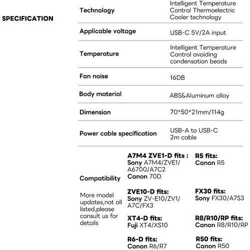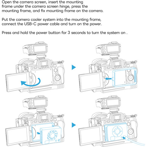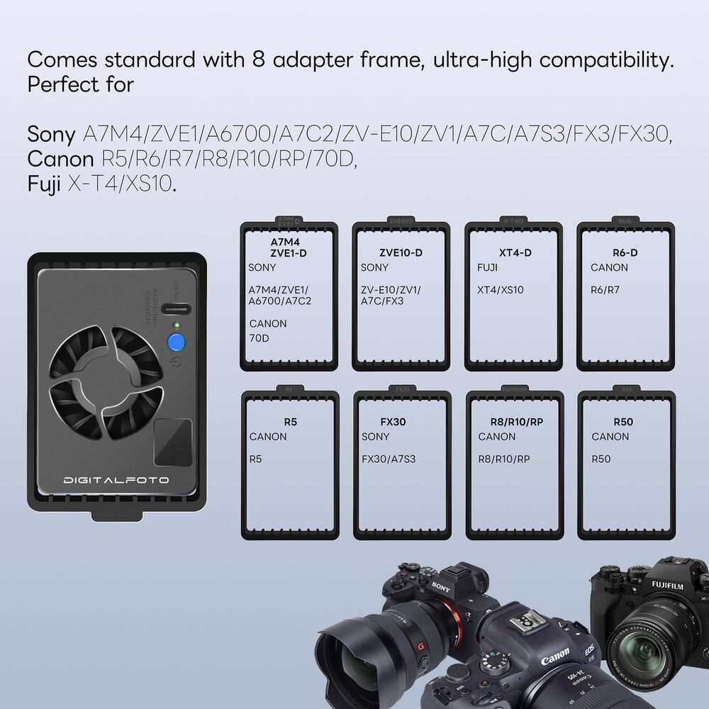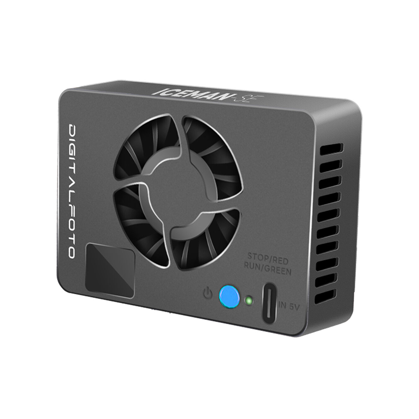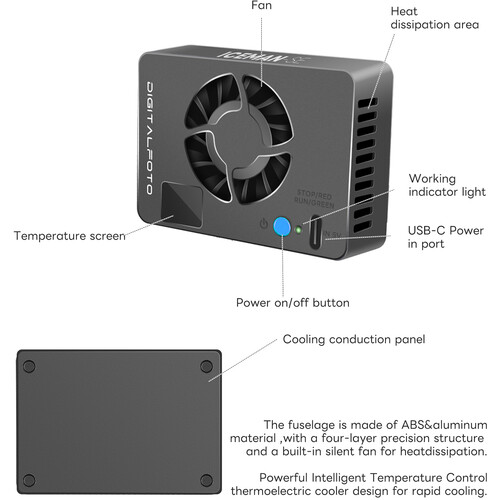 Secure the DigitalFoto Solution Limited ICEMAN-SE Intelligent External Cooler System to your compatible DSLR or mirrorless camera for long video shoots to avoid overheating. The thermoelectric system secures onto your camera of choice with eight different mounting frames. It is powered via USB-C 5V power input and the included 6.6′ cable. Intelligent temperature control integrated into the unit rapidly cools your camera without creating condensation. The fan operates with a near-silent noise output to not negatively affect your recording.