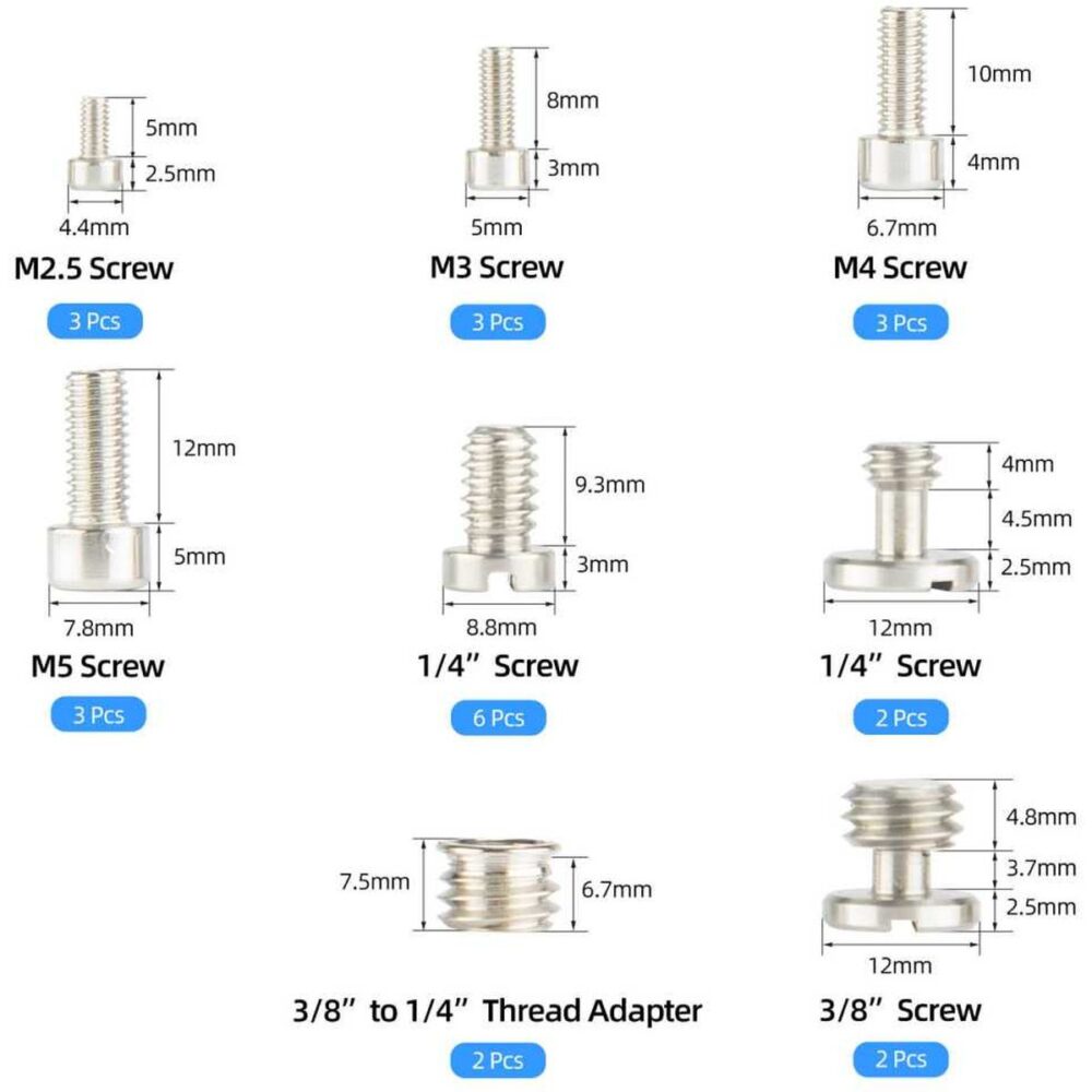 Multiple Stainless Steel Screws: It comes with three M2.5 screws, three M3 screws, three M4 screws, three M5 screws, eight 1/4” screws, two 3/8” screws.