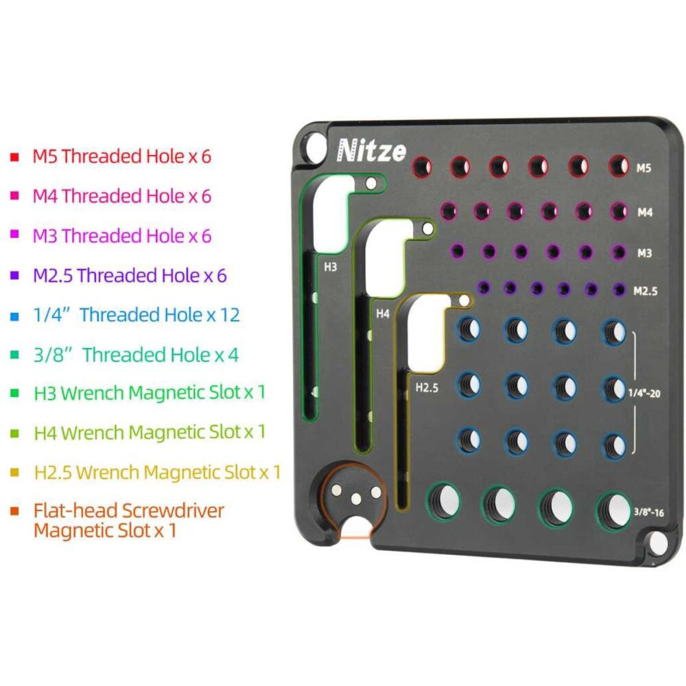 Storage Plate: There are six M2.5 threaded holes, six M3 threaded holes, six M4 threaded holes, six M5 threaded holes, twelve 1/4” threaded holes, four 3/8” threaded holes, one H2.5 wrench magnetic slot, one H3 wrench magnetic slot, one H4 wrench magnetic slot and one flat-head screwdriver magnetic slot.