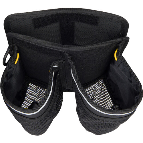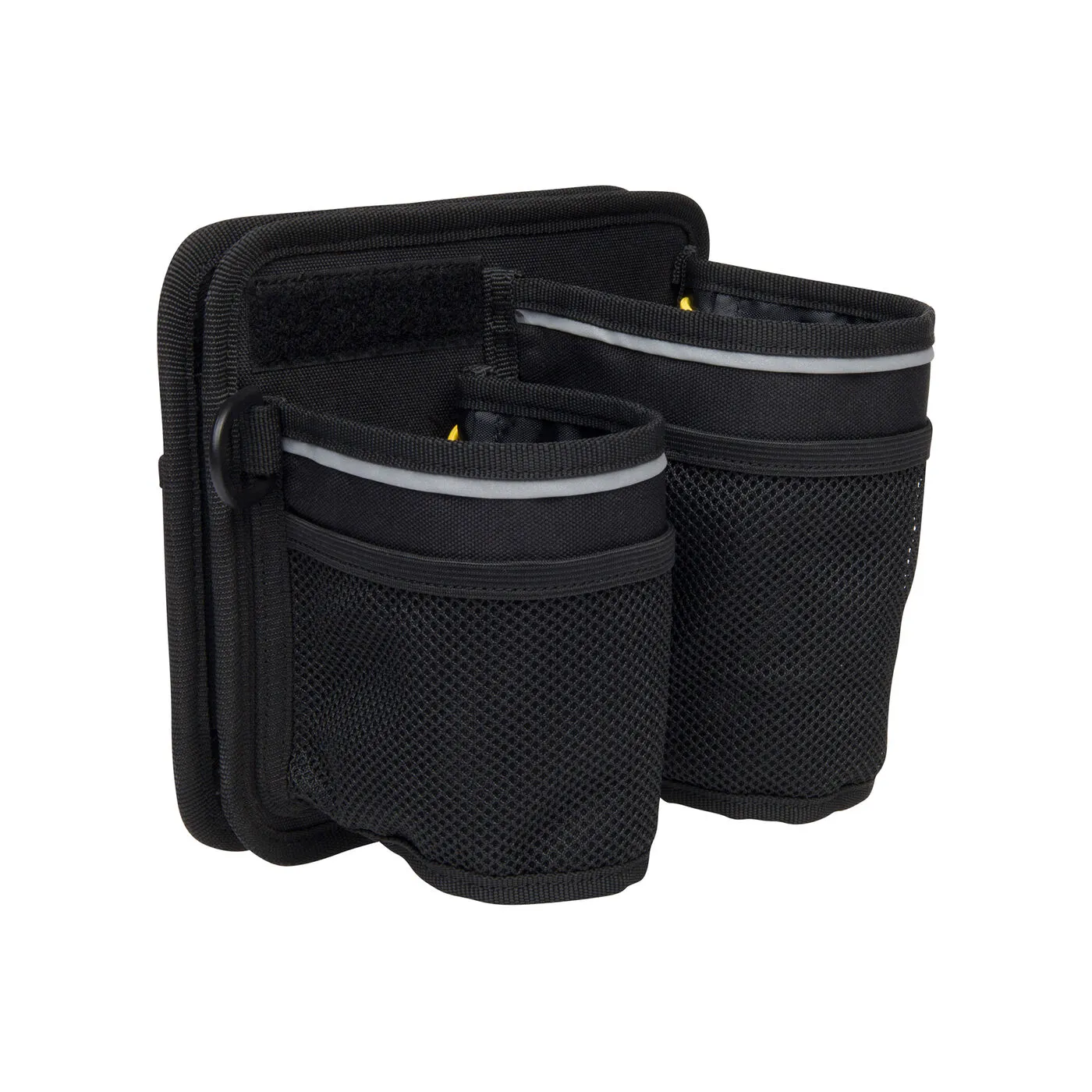 FRONT: Front side has a nylon D-ring for keys, carabiner and clips. There’s a hook&loop patch area for a customized look. Two mesh storage areas on the front side hold your snacks, bars, gum. The reflective safety stripe along the top improves your visibility when your ride arrives.