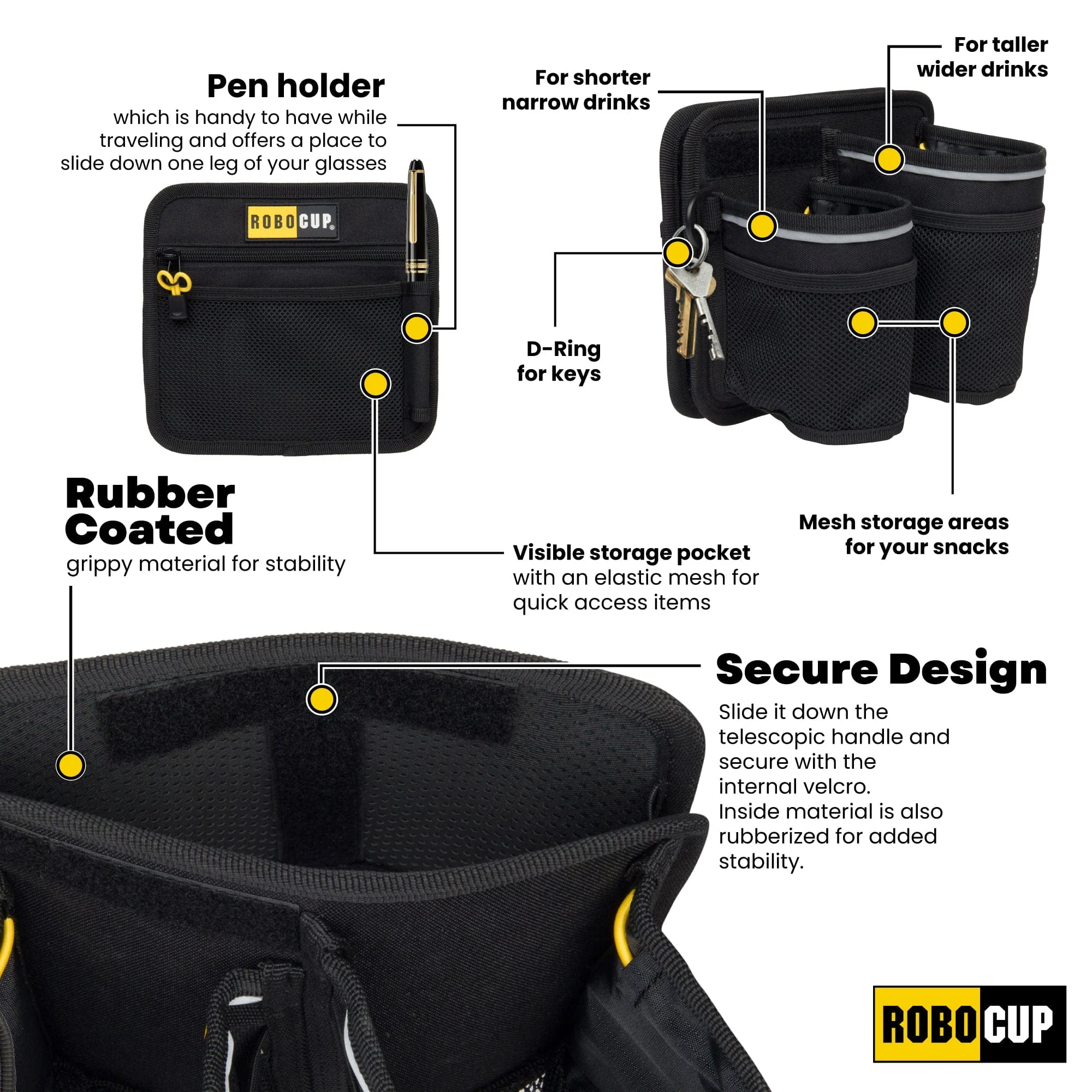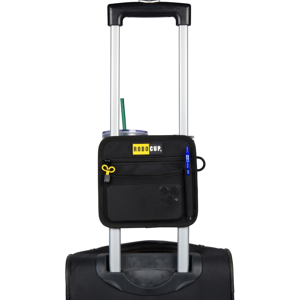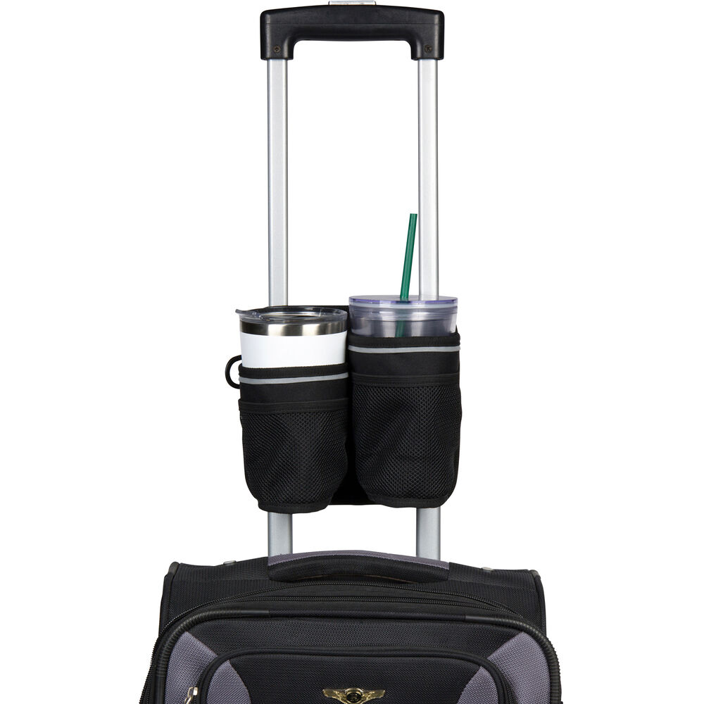 Travel-friendly folding dual drink holder with storage for cases, luggage and almost anything with a telescopic handle. Be hands free while keeping your valuables secure.